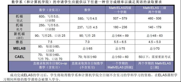 Math/ELAS课程是专为英语非母语,英语语言能力低于数学系全日制学习直接录取标准的学生而开设的。学生除符合所有英语以外的录取条件,还应该有很强的数学学术背景,并且有兴趣在滑铁卢大学的数学系或计算机学院学习。数学系和计算机学院的申请者必须提供以下任意一种英语语言考试的官方成绩单:托福(TOEFL),密执安英语语言评估测试(MELAB),雅思(IELTS)或卡尔加拿大学术英语评估测试(CAEL)。被数学系或计算机学院录取,但英语成绩低于最低录取标准的学生,也许会被录取到ELAS进行英语强化学习。在Math/ELAS就读的学生同时会在滑铁卢大学数学系或计算机学院根据将要就读的专业而选修一门数学必修课,这门课将会被算入学分。与此同时,学生将通过一个或两个学期在康尼斯嘉学院(Conestoga College)的学习来提高英语语言能力。